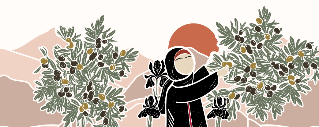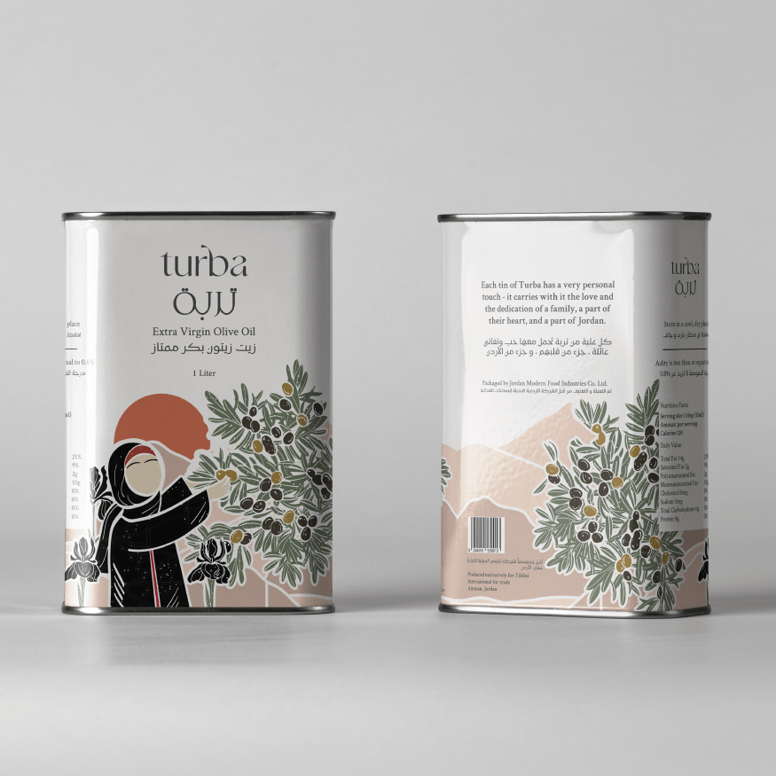 A custom illustration was made (by designer Deema Tabaza) displaying a scene from olive picking season and then applied to the oil can in an immersive way, making it perfect for shelf stacking and a piece of art in itself.